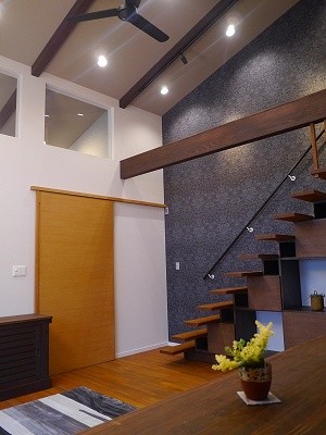 庵治の家Ⅱ 片流れの大屋根が印象的。ポーチのアクセント壁は櫛引で和モダンの雰囲気に仕上げました。自然と流れる風をうまく利用する間取りにしています。LDKは吹き抜けを利用して天井高をゆったりととり、開放的な空間となっています。2階の部屋の窓からのぞきこめばリビングが見渡せ開放感たっぷりです。 ギャラリー