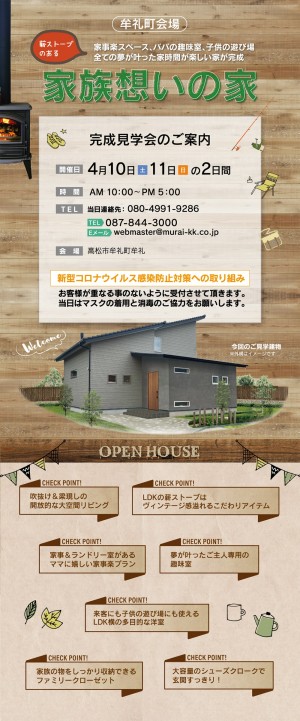 4/10(土).11(日)の2日間、高松市牟礼町で、薪ストーブのある家族想いの家の完成見学会を開催致します。吹抜け&梁表しの大空間リビングに、ヴィンテージ感ある薪ストーブ、ママに嬉しい家事ラクプラン、ご主人専用の趣味室、子供の遊び場にも使えるLDK横の多目的な洋室、大容量のファミリークロークやシューズクロークなど、ぜひ見て頂きたいお家です。お気軽にご来場下さい。