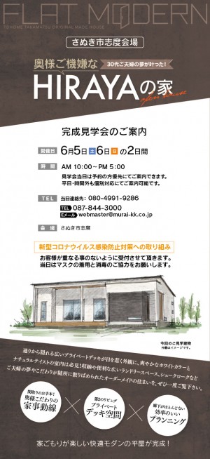 6/5(土).6(日)の2日間、さぬき市志度で、30代ご夫婦の夢が叶った!奥様ご機嫌なHIRAYAの家の完成見学会を開催致します。廊下がほとんどない効率の良いプランニング、ホワイトカラーとナチュラルテイストの室内、通りから隠れるプライベートデッキ、奥様こだわりの家事動線、豊富な収納やシュークローク、広いランドリースペースなど、ぜひ見て頂きたいお家です。お気軽にご来場下さい。見学会当日は予約の方優先にてご案内できます。平日・時間外も個別対応にてご案内可能です。