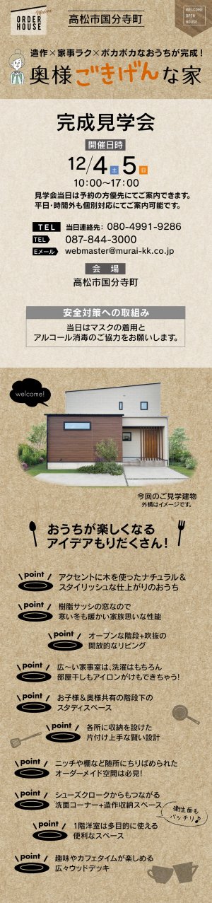 12/4(土)・5(日)の2日間、高松市国分寺町で、造作×家事ラク×ポカポカで奥様ごきげんな家の完成見学会を開催致します。