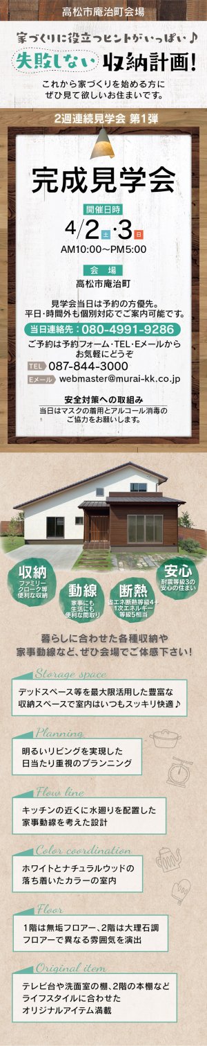 4/2(土)3(日)の2日間、高松市庵治町で、収納や家事動線にこだわった家づくりに役立つヒントがいっぱいの家の完成見学会を開催致します。