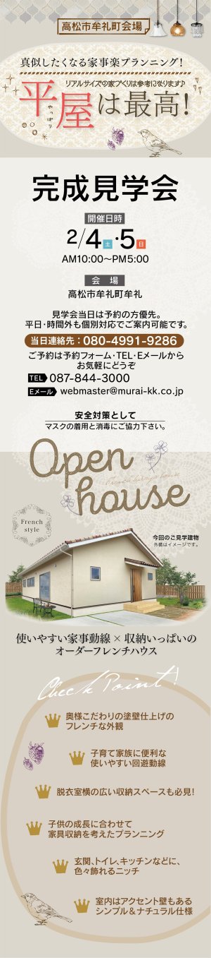 2/4(土)5(日)の2日間、高松市牟礼町で、真似したくなる家事楽プランニング!「平屋は最高のフレンチハウス」の完成見学会を開催致します。