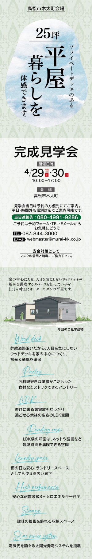 4/29(土・祝日)・30(日)の2日間、高松市木太町で、プライベートデッキのある25坪の平屋の完成見学会を開催致します。