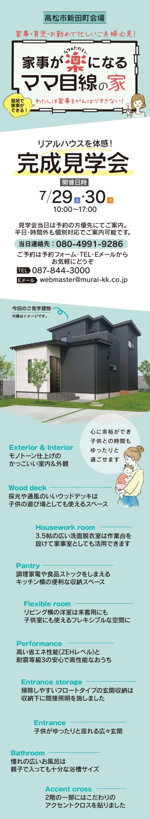7/29(土)30(日)の2日間、高松市新田町で、家事が楽になるママ目線の家の完成見学会を開催致します。