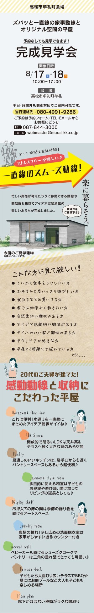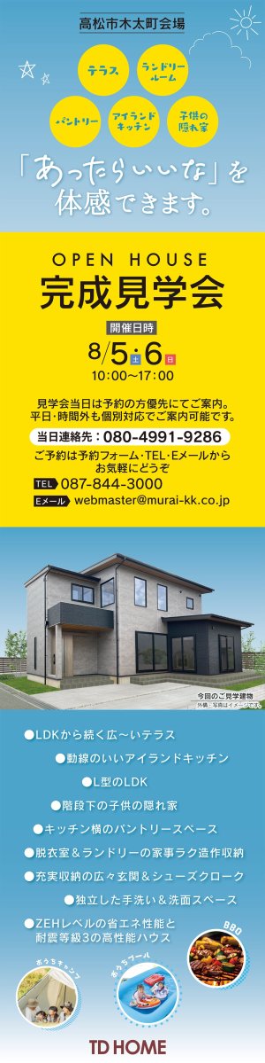 8/5(土)6(日)の2日間、高松市木太町で、「あったらいいな」が叶ったおうちの完成見学会を開催致します。