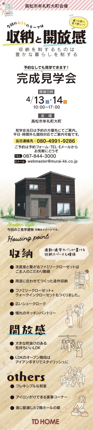 TDホーム高松は、香川、高松で新築の家づくりをしています。今回、高松市国分寺町で見学会(内覧会・オープンハウス)を開催予定。
