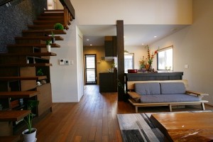 片流れの大屋根が印象的。ポーチのアクセント壁は櫛引で和モダンの雰囲気に仕上げました。自然と流れる風をうまく利用する間取りにしています。LDKは吹き抜けを利用して天井高をゆったりととり、開放的な空間となっています。2階の部屋の窓からのぞきこめばリビングが見渡せ開放感たっぷりです。