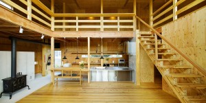 施主様こだわりの波スレートとウッドの外観は倉庫のような無骨な箱のようなイメージ。玄関からキッチンはひとつながりの土間となっています。2階の寝室や個室など扉を極限まで省いたフラットな室内となっています。