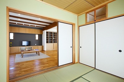 ホームパーティーに対応できる27畳のLDKに子どもたちの遊び場にもなる広いウッドデッキも備えました。和室を合わせるとさらに広がりのある空間になり、大人数のゲストも余裕を持って招待できます。