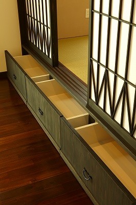 ワンフロアを見渡せるLDKや小上りになった和室の段差には引出収納を設けました。