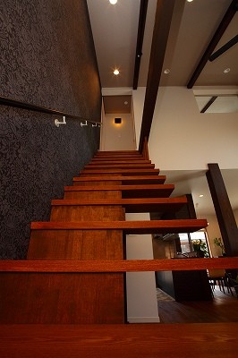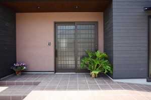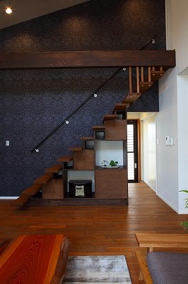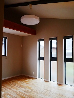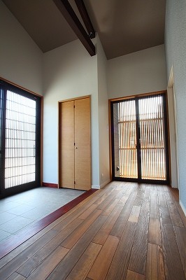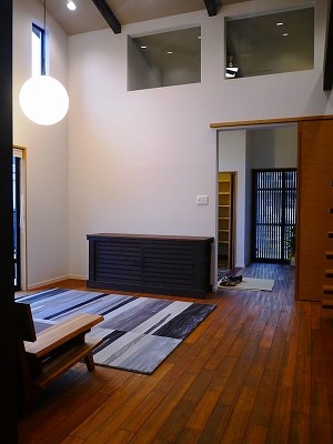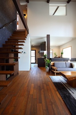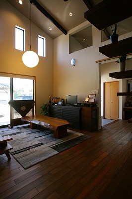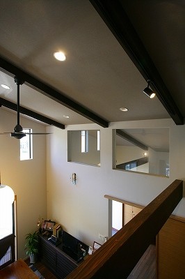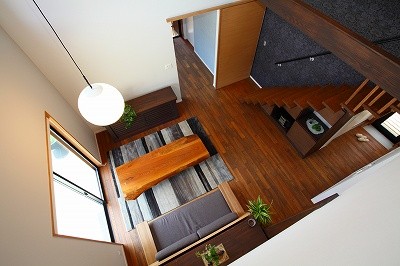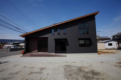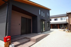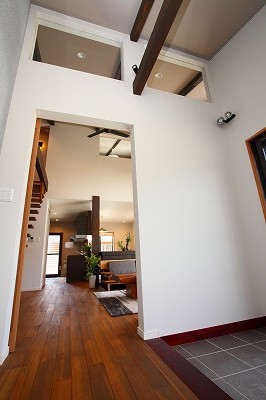 庵治の家Ⅱ 片流れの大屋根が印象的。ポーチのアクセント壁は櫛引で和モダンの雰囲気に仕上げました。自然と流れる風をうまく利用する間取りにしています。LDKは吹き抜けを利用して天井高をゆったりととり、開放的な空間となっています。2階の部屋の窓からのぞきこめばリビングが見渡せ開放感たっぷりです。 ギャラリー