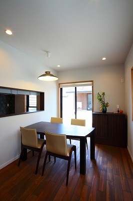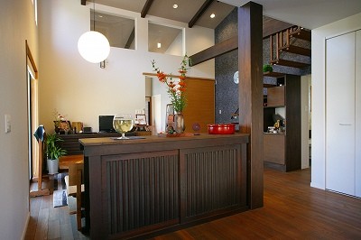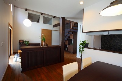 施工実例 庵治の家Ⅱ 片流れの大屋根が印象的。ポーチのアクセント壁は櫛引で和モダンの雰囲気に仕上げました。自然と流れる風をうまく利用する間取りにしています。LDKは吹き抜けを利用して天井高をゆったりととり、開放的な空間となっています。2階の部屋の窓からのぞきこめばリビングが見渡せ開放感たっぷりです。 ギャラリー 施工実例に戻る