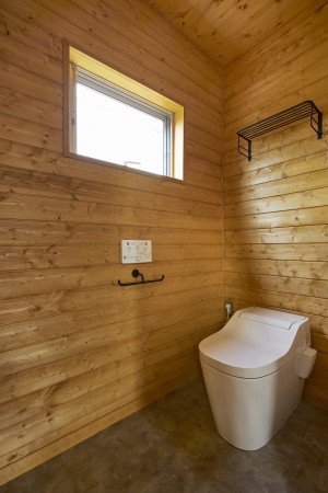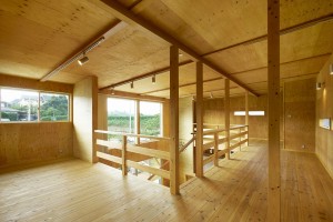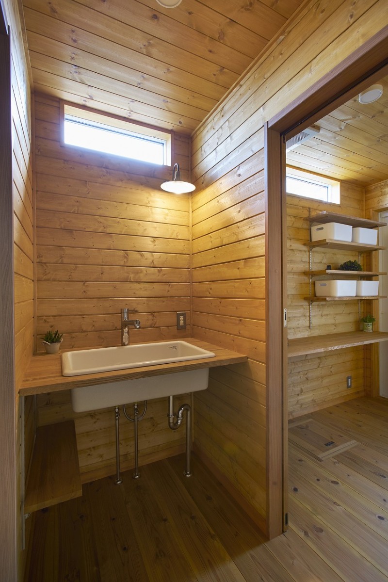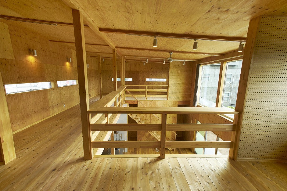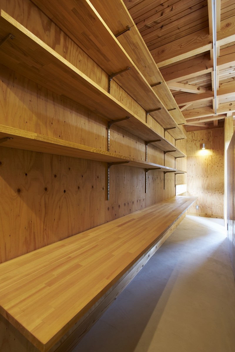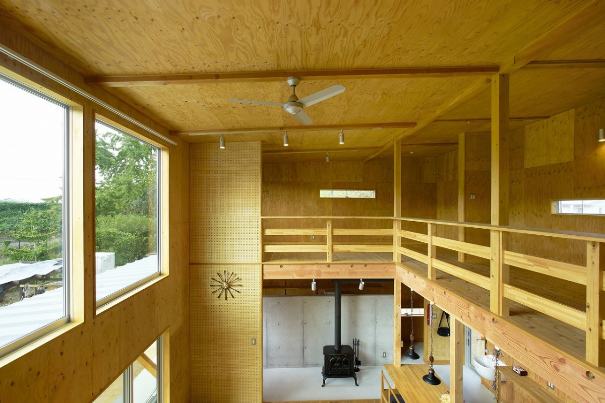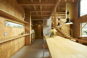 施主様こだわりの波スレートとウッドの外観は倉庫のような無骨な箱のようなイメージ。玄関からキッチンはひとつながりの土間となっています。2階の寝室や個室など扉を極限まで省いたフラットな室内となっています。