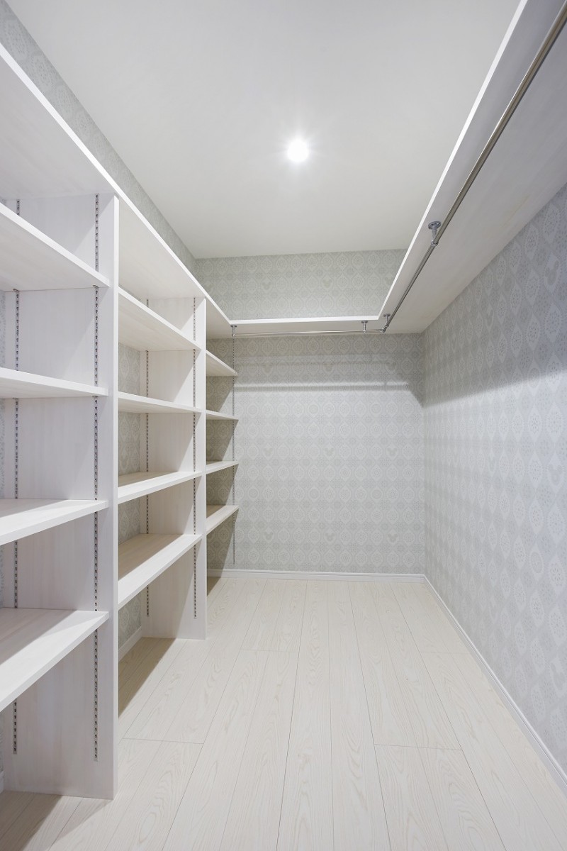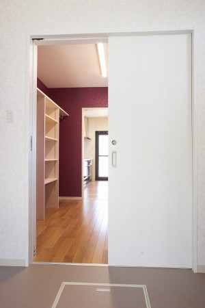 奥様のことを考えた家事同線で大容量の収納を備えた家事室は大胆な柄、色づかいで入るだけで元気でハッピーな気分になれそうです。