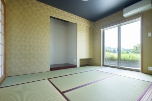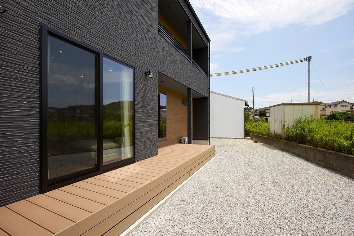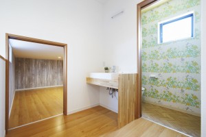 ご主人の希望で玄関を通らず人工芝を敷いた土間から直接脱衣所へ入れ、広々とした浴室でゆったりできます。